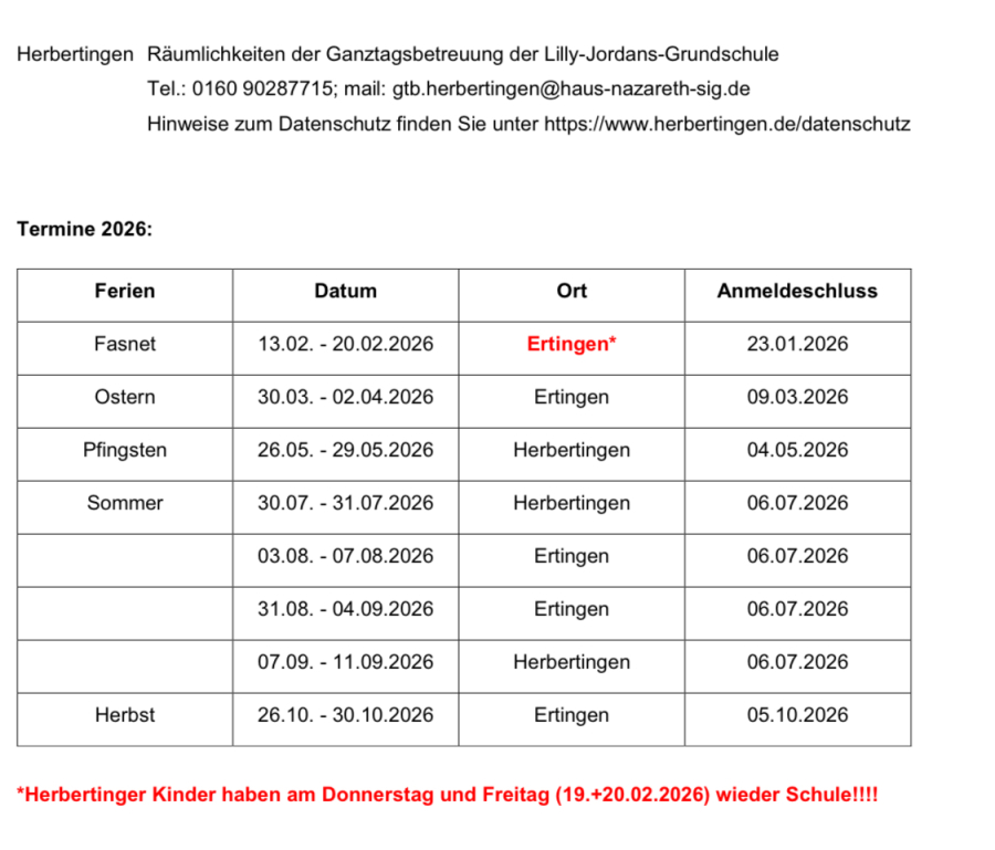 In beinahe allen Schulferien bieten die Gemeinde Ertingen & Herbertingen in Kooperation mit den Jugendsozialarbeiten vom Haus Nazareth eine Betreuung im Zeitfenster von max. 7:00 - 16:00 Uhr an. Die Kosten belaufen sich auf 5 € (halbtags) bzw. 10 € (ganztags). Die genauen Termine für das ganze Schuljahr werden hier und im Mitteilungsblatt veröffentlicht.