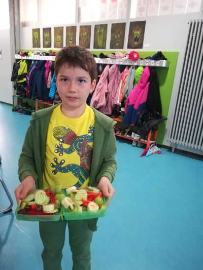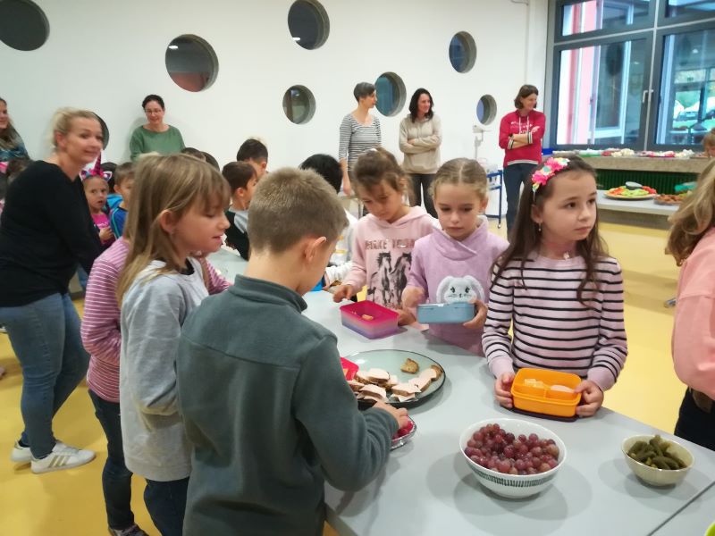 Mit großen Augen und leeren Vesperdosen kamen die Schüler und Schülerinnen Klasse für Klasse an das Buffet. Sie fanden Gemüsesticks, Dip, Obst, Käsewürfel, liebevoll belegte Brote und Hackfleischbällchen vor, die schnell ihren Weg in die Vesperdosen fanden. Vielen Dank an den Förderverein und die vielen helfenden Hände!