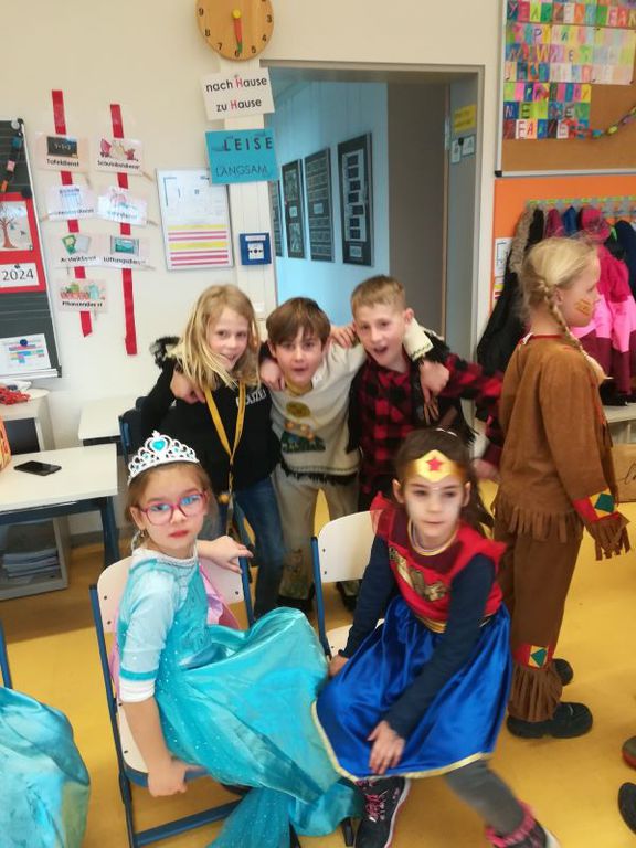 Am Donnerstag ging es bei uns wieder richtig närrisch zu. Das ganze Schulhaus wurde in eine bunte und ausgelassene Stimmung versetzt. Überall konnte man Hexen, bunte fantasievolle Tiere, gruselige Gestalten, Disneyfiguren, Kämpfer, und riesengroße Kuscheltiere fröhlich herumhüpfen sehen. Das Lilly-Kollegium hatte sich passend zum Motto "Wir" in grüne Kuscheltierwirs verwandelt. Unser Narrenruf "Wir sind die Lillys- die Lillys sind WIR!" hallte durch die Gänge. In den Klassenzimmern wurde gefeiert und es gab wieder eine tolle Polonaise durch das ganze Gebäude. Es wurde ausgelassen getanzt und schließlich in den Klassenzimmern die Lehrerinnen versteckt. Die Herbertinger Narren befreiten uns dennoch alle und ab dem Zeitpunkt waren Schüler*innen und Lehrerinnen in die schulfreie Zeit entlassen. Die Musik war super, die Wurst lecker und in der Alemannenhalle gab es Spiele und Getränke. Vielen Dank für diese gelungene Aktion und allen schöne närrische freie Tage!